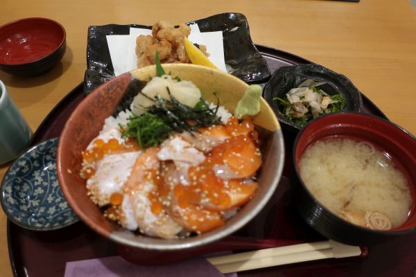 11時半過ぎに、南三陸の道の駅で休憩。 海鮮系の飲食店や売店があり、フードコートの様になってる。 刺身を個別売りしてる勝手丼みたいな店が気になるが、普通の飲食店に入る。 マグロが採れるみたいだけど、マグロ丼って三陸のイメージが無い。