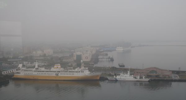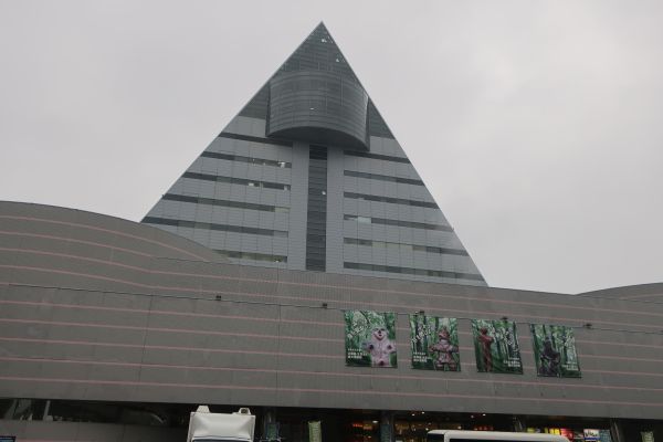 船外に出た後は、前から写真を撮るために移動する。 最後に、観光物産館アスパムへ。 手前にねぶたを作る巨大なテントがあり、窓から中を見ると