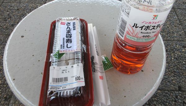 写真を撮った後、東屋がある正規の展望スポットへ移動する。 11時半前と少し早いが、先ほど購入した押し寿司を広げる。