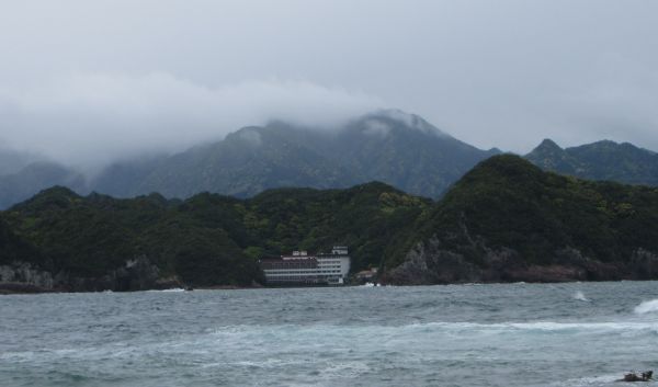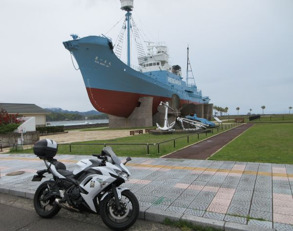 風呂は内風呂と露天があったので、まずは露天風呂へ。 硫黄臭がする透明な湯で、かけ流しっぽかった。 夕飯は旅館飯の簡易版って感じ、ごはん・お茶はセルフサービス。 外国人客が多い宿だなと思った。アジア系と欧米系は半々ぐらいかな。 地元の純米大吟醸を追加でもらい、夜中に腹が減らないように2膳いただく。 部屋に戻って明後日以降のホテル予約のつもりが、調べてたら寝落ち・・・。 明日の天気が微妙なので、ユニットバスの洗面器で洗濯に挑戦する。 7日と8日の宿を予約、これで全ての宿予約が完了。 --------- 駐輪 :ホテル前の平面駐車場 ---------- 7時過ぎに起床、外は予報通りの雨。 洗濯物を確認、まだ濡れている。 とりあえず朝風呂へ。 朝食はアジの干物がメインの旅館飯。 昼が少なくて良いように、ごはんを2膳食べておく。 天気予報だと14時ぐらいに雨が止むようだ。 近くの観光地といえば、ウミガメ公園と くじら博物館ぐらいか。 くじら博物館がある太地町を調べると、岬や灯台などの景勝地があった。 ニコニコ動画でアニメをいくつか視聴、パスワード忘れてたけど 13時に昼食、昨日買っておいた和歌山カップ麺を食べる。 14時過ぎに雨が止んでるように見えたので少し外出する事にしたが とりあえず、近くのコインランドリーに入って乾燥機をかける。 衣類の感想が終わっても霧雨は変わらずなので、ホテルに戻ろうとローソンで酒とつまみを購入。 まずは捕鯨船、めちゃでかい。全長70mの船ってすごいでかい。