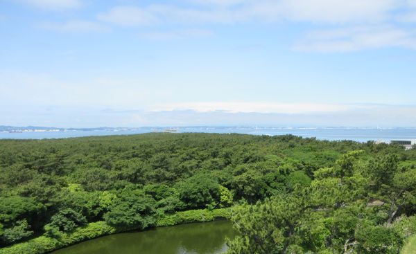 3方向が海で真下が森、景観は良い感じ。 島にある丸いコンクリが砲台跡なんだろうか。 島を出て森の中を散策する。
