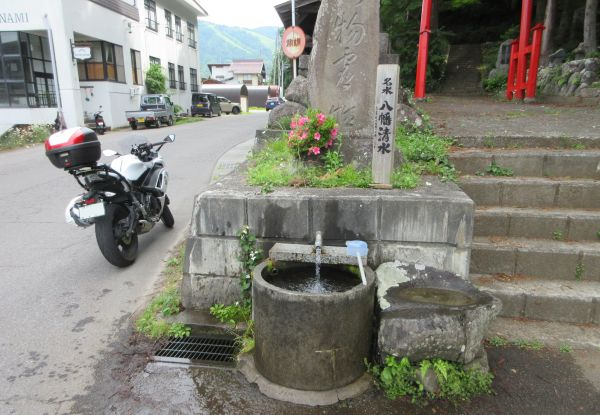 14時過ぎに関田峠に到着、駐車スペースは空いてるけど日陰のベンチが無い。 展望台があったが炎天下の下で、少し走ったチェーン着脱場に日陰があったので休憩する。 セブンイレブンで購入した冷凍スイーツいまいち、素直にアイス買うんだった。 県道116で山を降りて川を渡り、県道353で野沢温泉へ。 ここの水も冷たくて美味しい。 最初に汲んだ中手の名水は、既に残り少なかったので 15時過ぎに宿に到着、チェックイン早すぎだろう。 部屋に入ると冷房が効いてて最高。到着予定18時だったのに嬉しい誤算。 少し休憩した後、外湯へ出かける。 行ってない外湯は残り4つ、今回は 中尾の湯へ向かう。