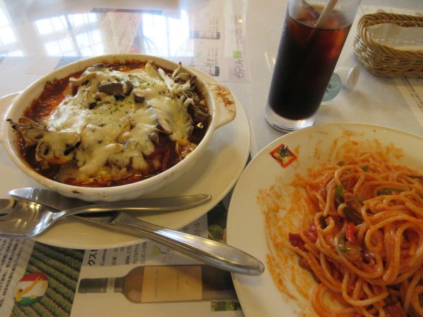 路上温度計は19度、さすがに涼しい。 万座ハイウェーか草津経由かルートを迷うが、まだ時間が早いので 予想通り、あまり混雑ないまま山を下って草津町へ。 甘いものが食べたい気がしたので、シュークリームで糖分補給。 終点の厚田ICから県道28 裏榛名へ。 30分ほどで榛名湖へ、ここは涼しくて良い。 県道28を選択、最初は狭い道で走りにくく、車を追い越すのが面倒な道。 13時過ぎにシャンゴ本店に到着する。 店に入ると5組ほど待ってる感じ。 15分ほどで店内へ。来るのは1年半ぶりだ。 2週前にシャンゴ風を食べてるし、ミートソースとベスビオソースは買って帰るので すぐにナポリタンが到着、濃厚で美味い、そして量が減らない。